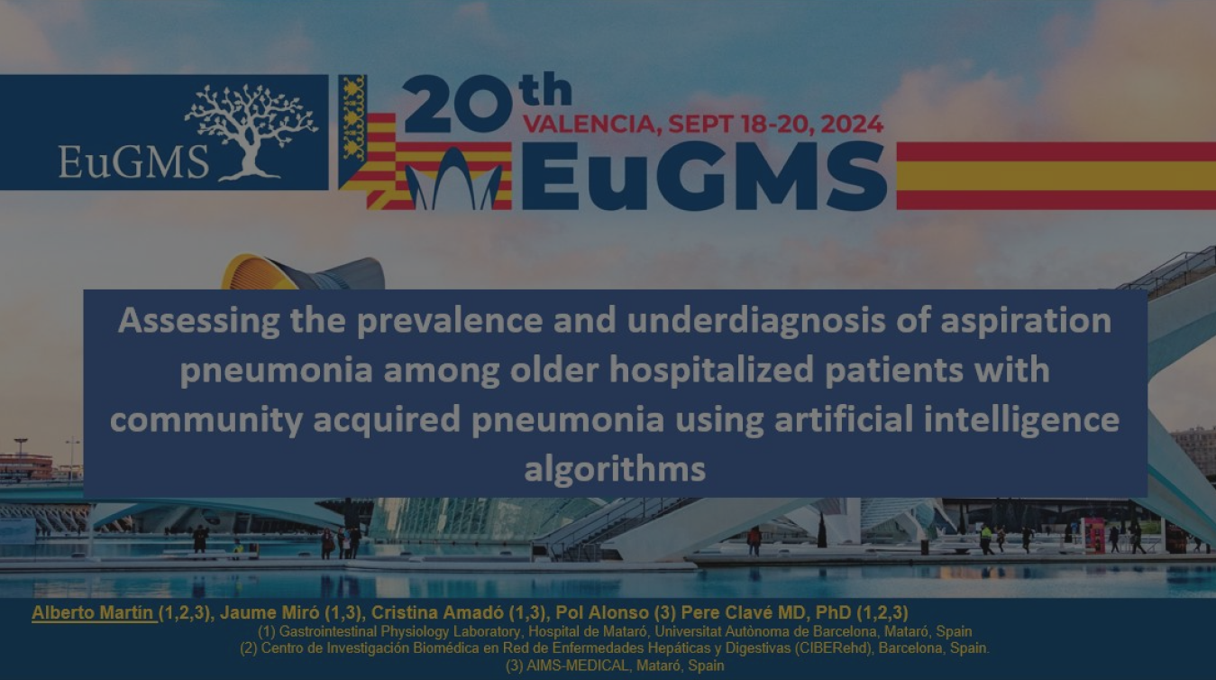 AIMS MEDICAL participated in the 2024 Congress of the European Society of Geriatric Medicine (EUGMS), held in Valencia, where we were awarded the Best Spanish Oral Communication. During this key event, our co-founder, Alberto Martín, presented the innovative study entitled “Assessing the prevalence and underdiagnosis of aspiration pneumonia among older hospitalized patients with community acquired pneumonia using artificial intelligence algorithms.”